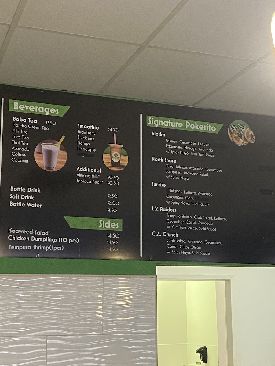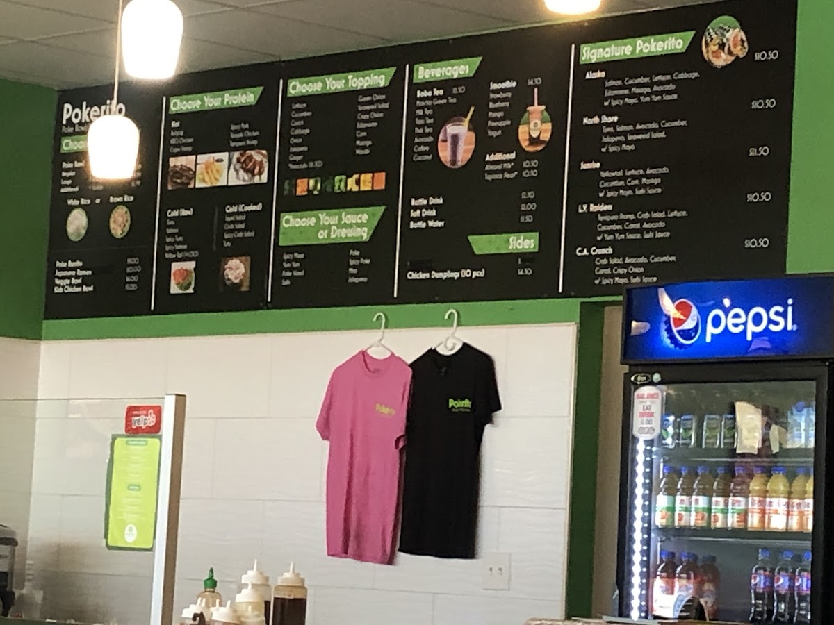 The menu at Pokerito features a selection of Asian fusion and Japanese dishes with a focus on poke bowls, sushi rolls, and beverages. The offerings are organized into distinct categories to accommodate various dining preferences, from light meals to more substantial options.