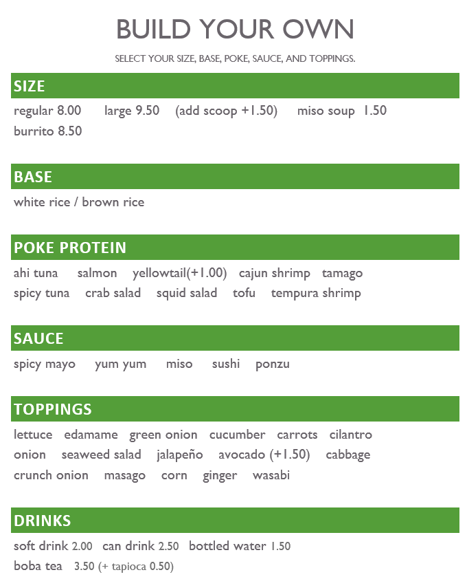 This menu is suitable for casual dining and quick meals, offering customizable options suitable for lunch or light dinner. The structure allows visitors to select between poke bowls, sushi rolls, and refreshing beverages according to their preferences.
